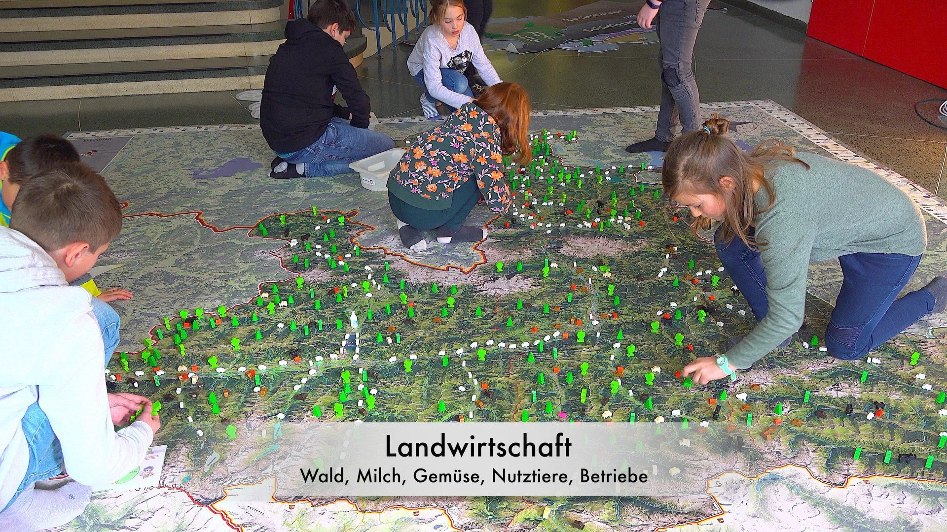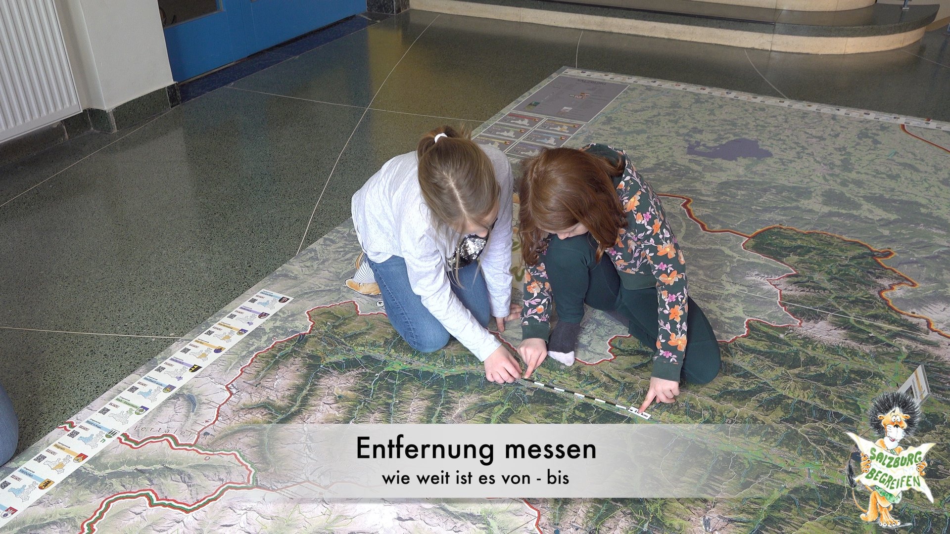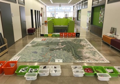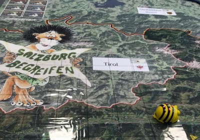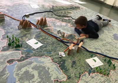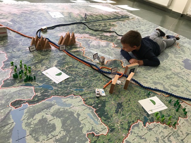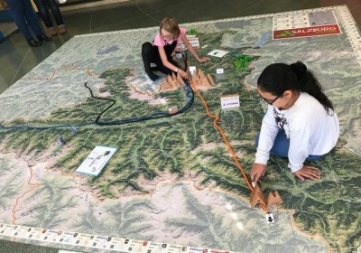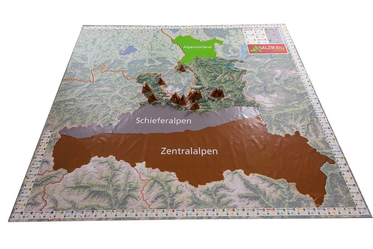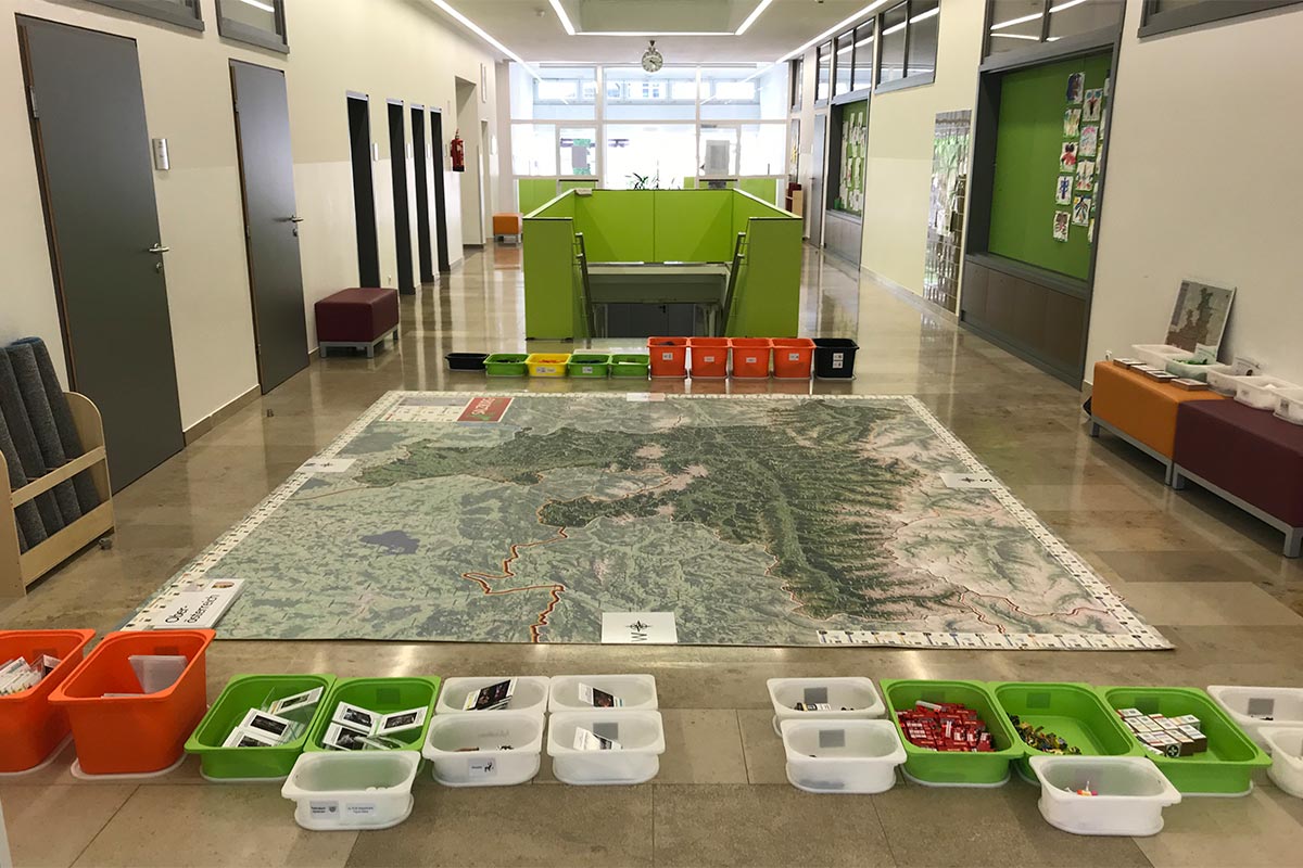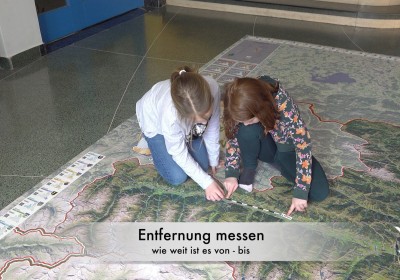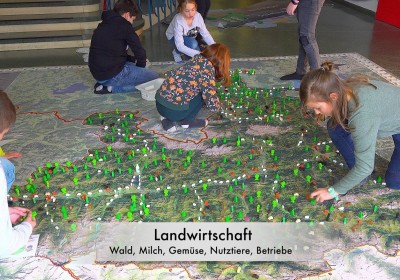 Statt mit dem Finger auf der Landkarte, bewegen wir uns zu Fuß auf einem überdimensionalen Abbild unseres Bundeslandes und verwandeln dieses durch Auslegen von Materialien in eine lebendige 3D Landschaft.
