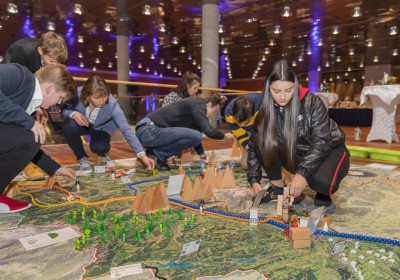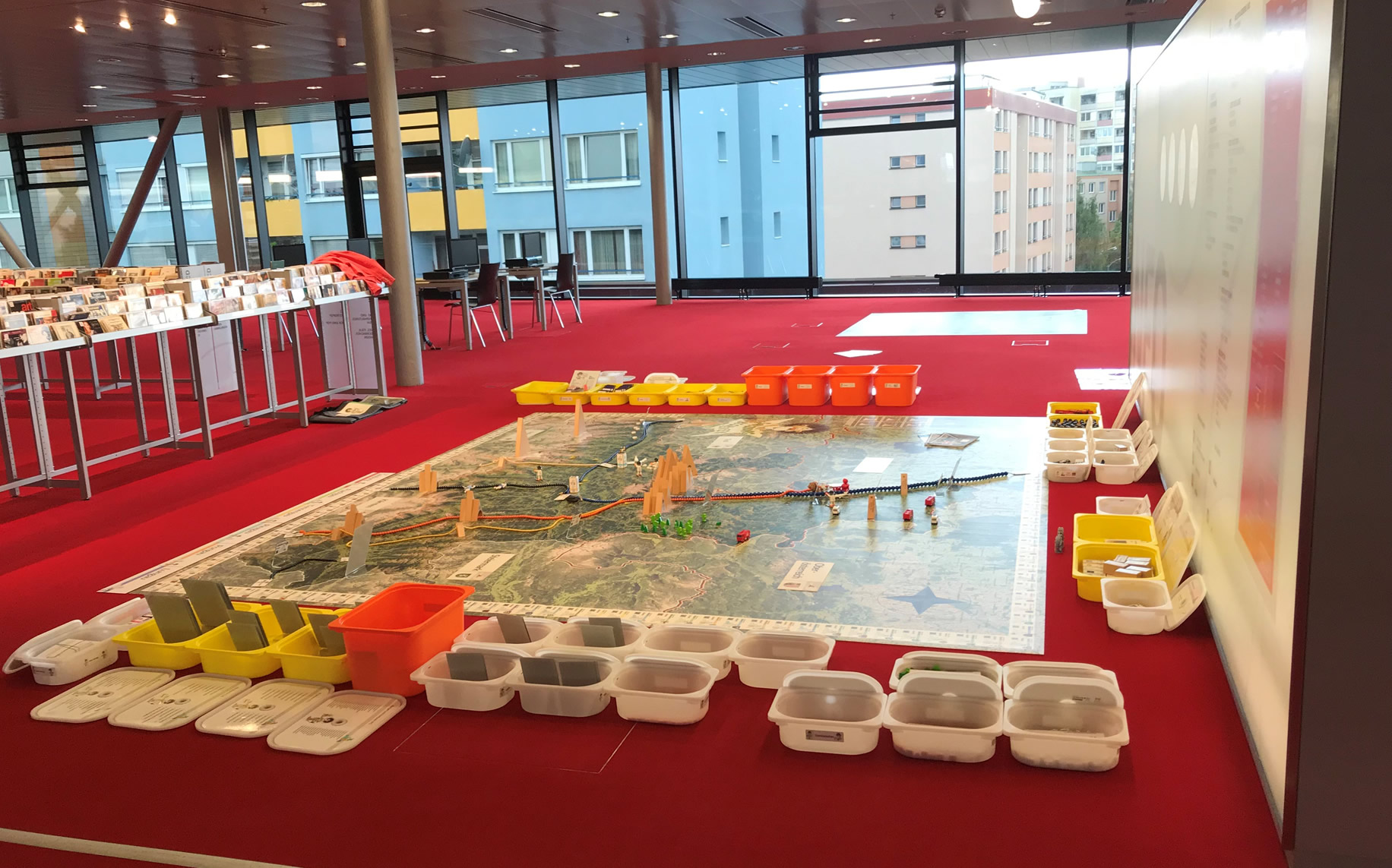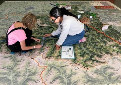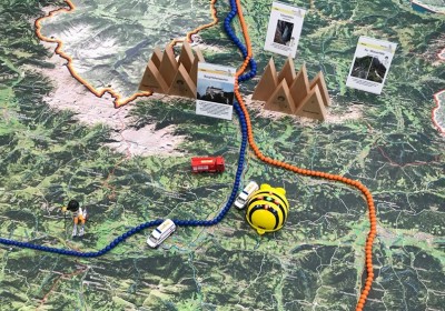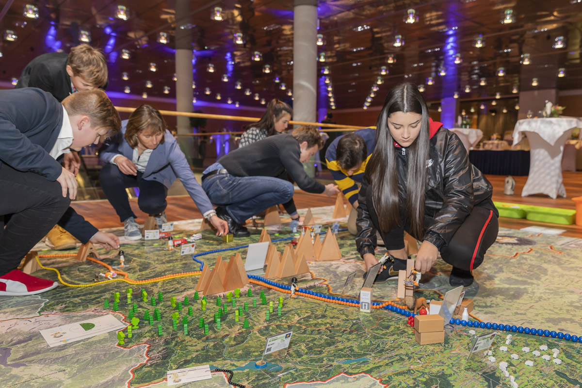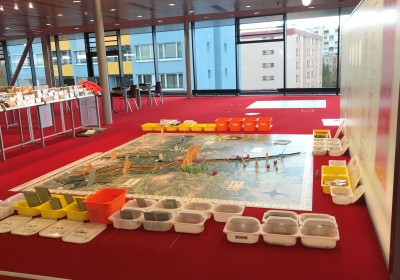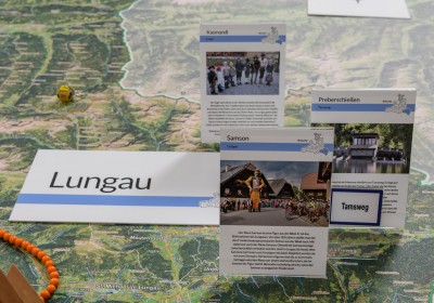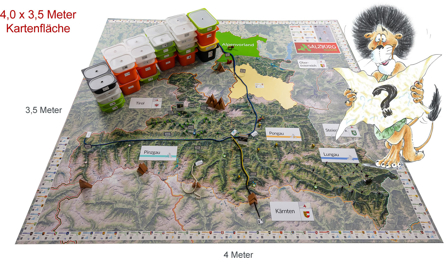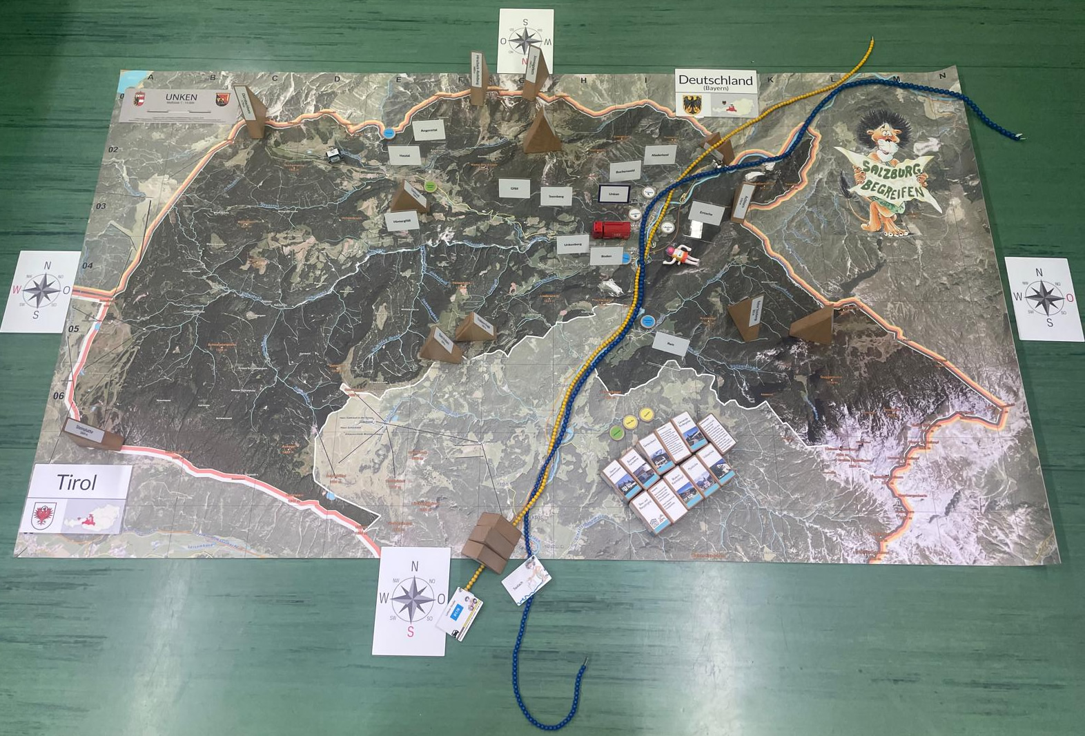Statt mit dem Finger auf der Landkarte, bewegen wir uns zu Fuß auf einem überdimensionalen Abbild unseres Bundeslandes und verwandeln dieses durch Auslegen von Materialien in eine lebendige 3D Landschaft.